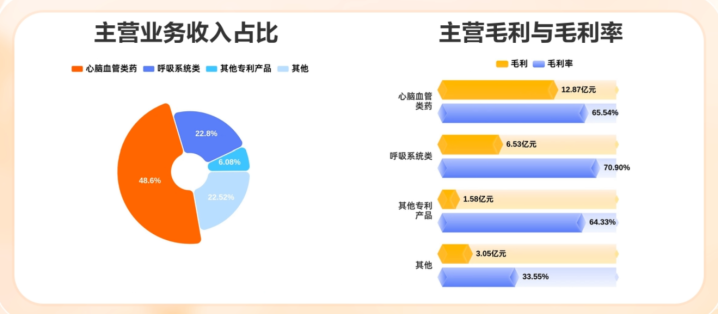 主营业务方面,心脑血管内药占据了公司的收入大头,提供了12.87亿元的毛利润。此外,呼吸系统类是公司毛利率最高的业务达70.9%。