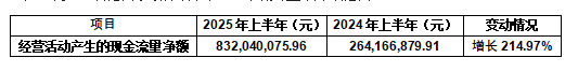 经营活动产生的现金流量净额为8.32亿元,上年同期为2.64亿元,增长214.97%。主要是销售回款增加影响,表明公司经营活动创造现金的能力大幅增强,经营质量得到提升。