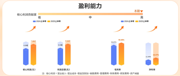 盈利能力方面,本期公司的核心利润对总利润的贡献较高,其中核心利润相比去年同期上涨27.05%。利润总额上涨24.92%。毛利率从去年的53.37%上涨到今年的59.48%,净利率从去年的11.44%上涨到今年的16.47%。